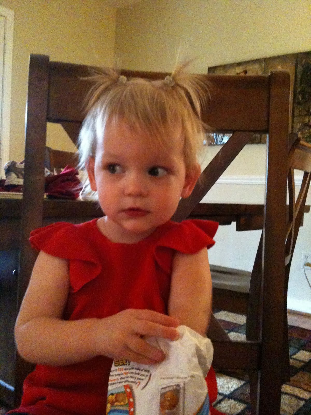 Just as it's not funny that Katherine is afraid of that remote-controlled helicopter I mentioned. At least, it's not very funny. But she gets so excited, and squeals and reaches for it, and then it swoops or moves toward her and she gets spooked and you can hear her little feet slap-slap-slapping away down the hall. Or she just barrels into the nearest pair of legs and grabs on for dear life. Or she ducks and covers, usually in the safe little nook under the slide of the climber she got for Christmas.